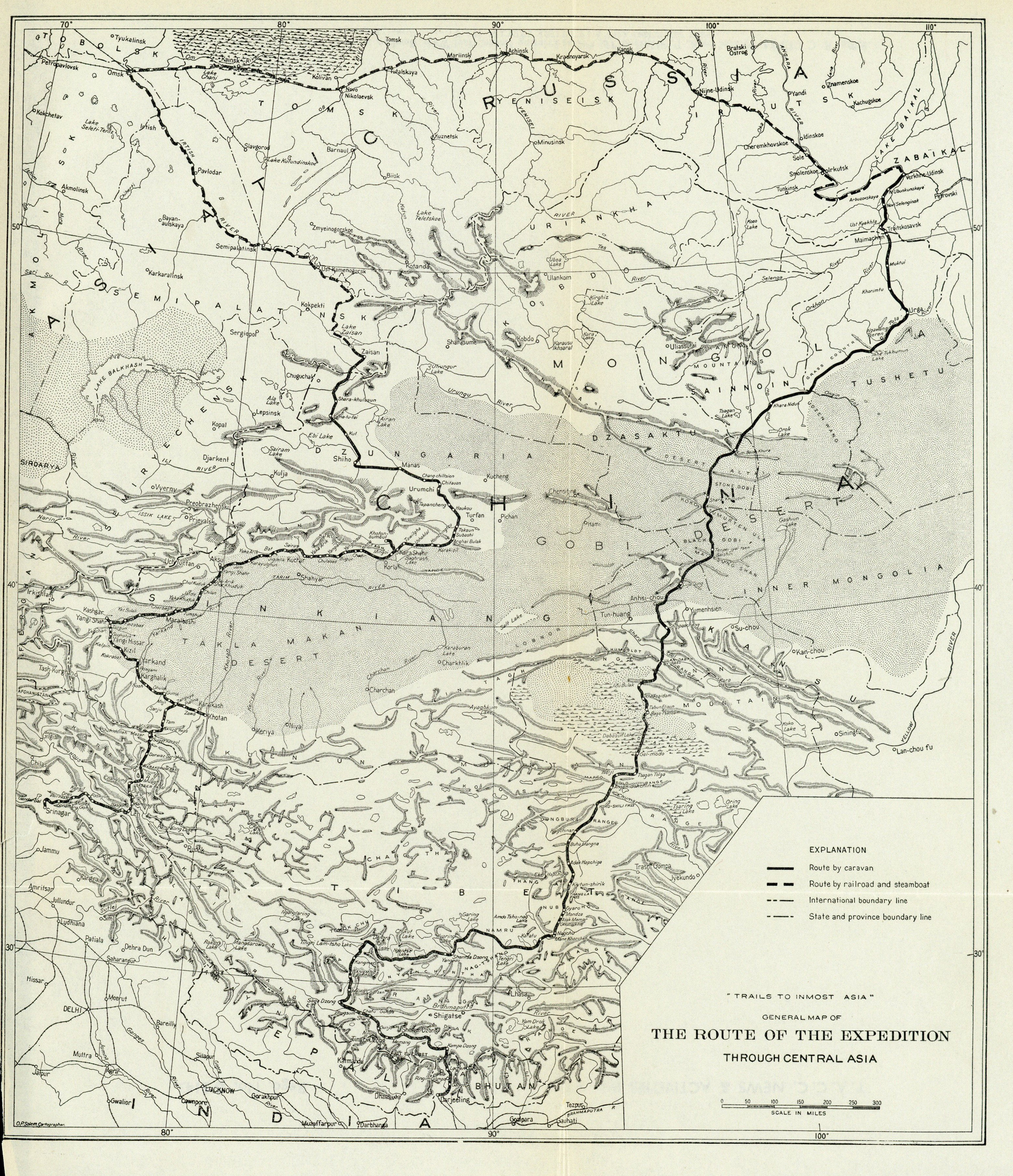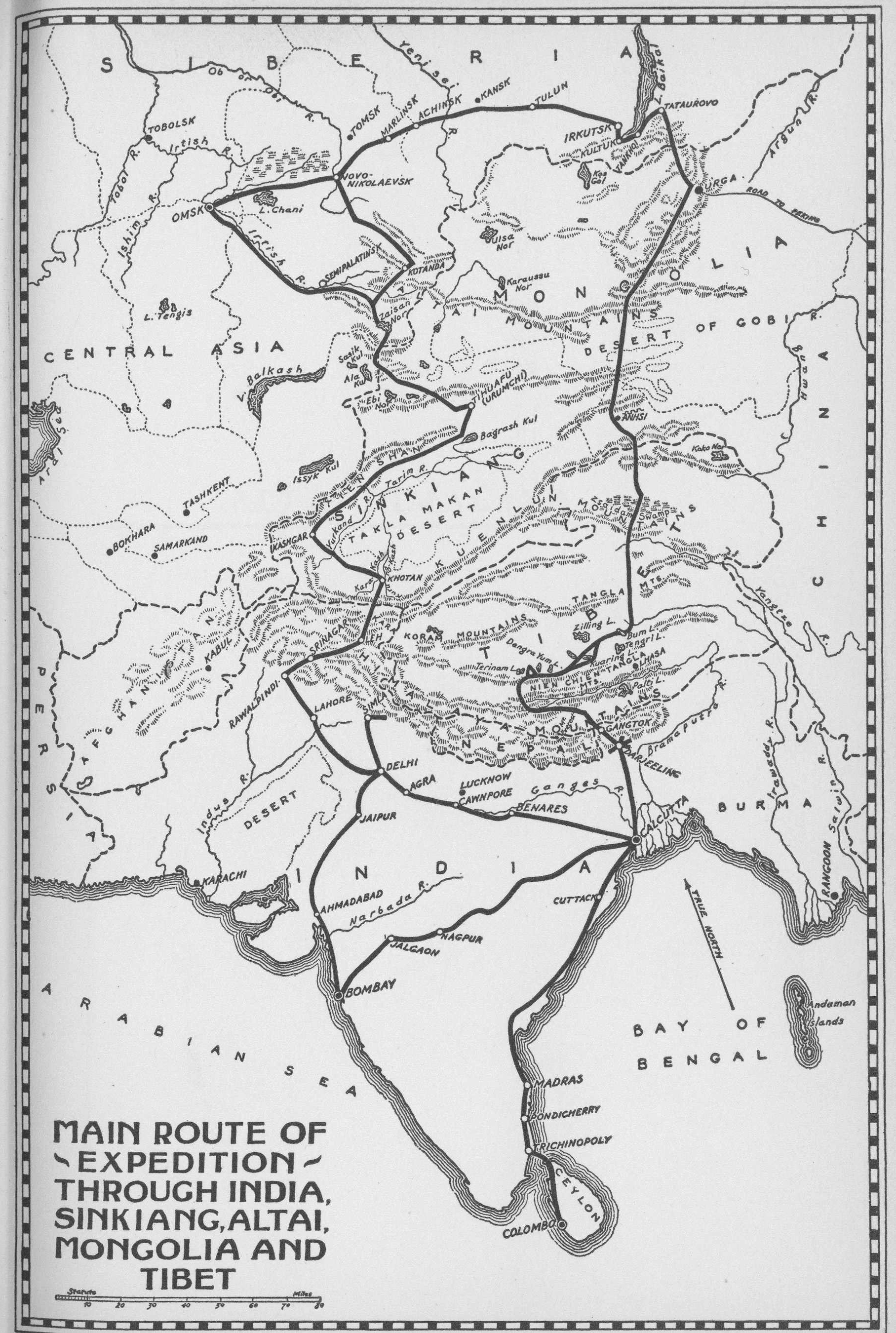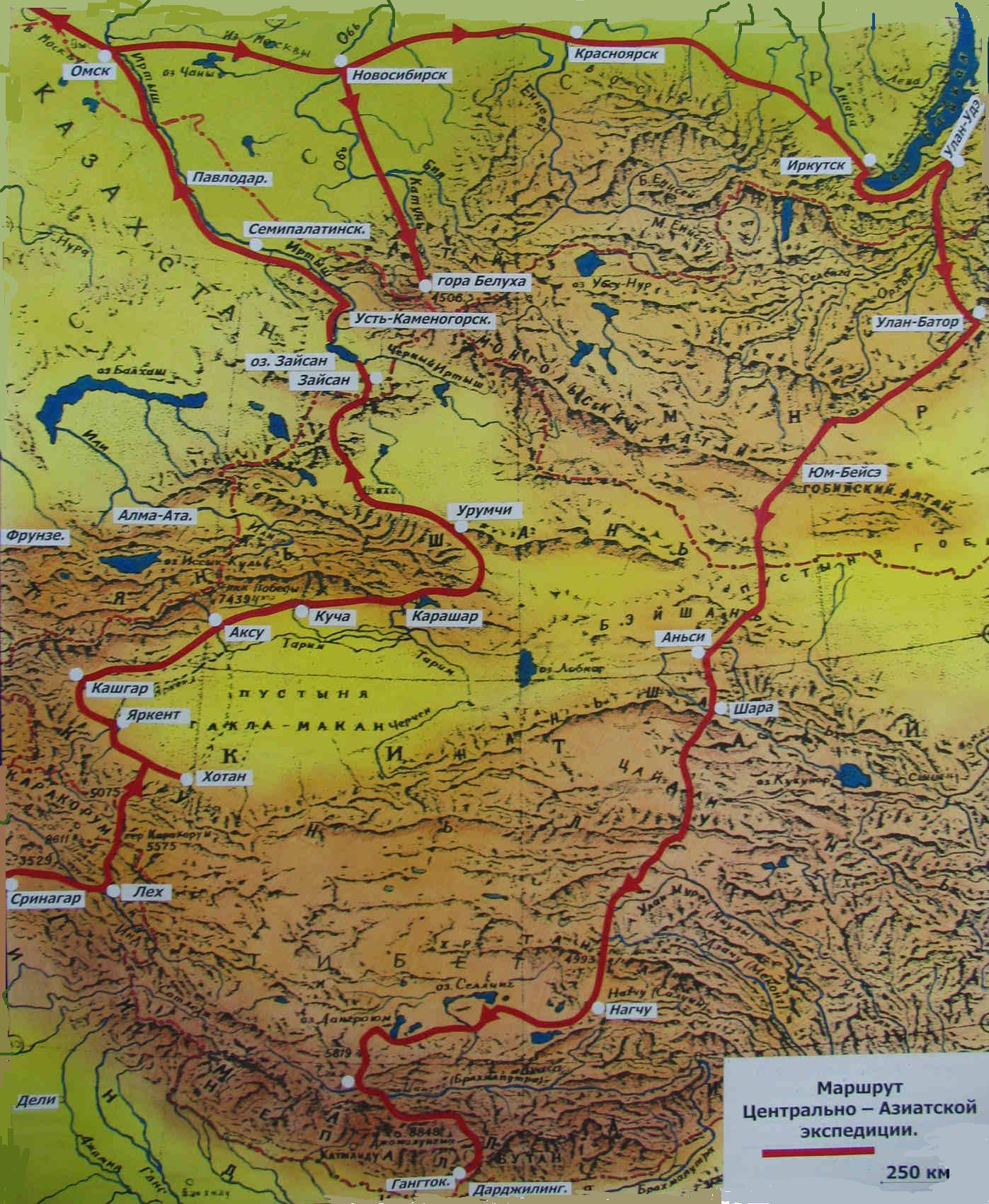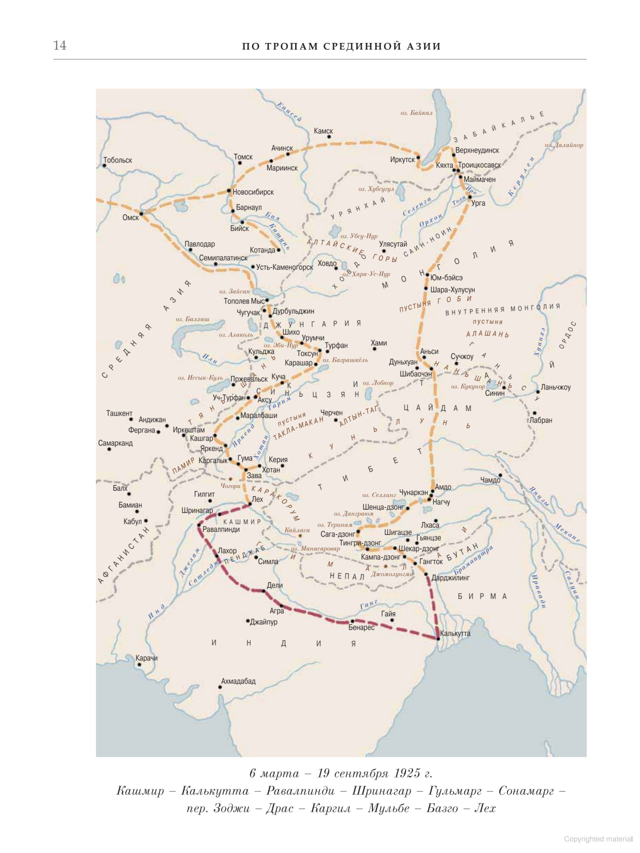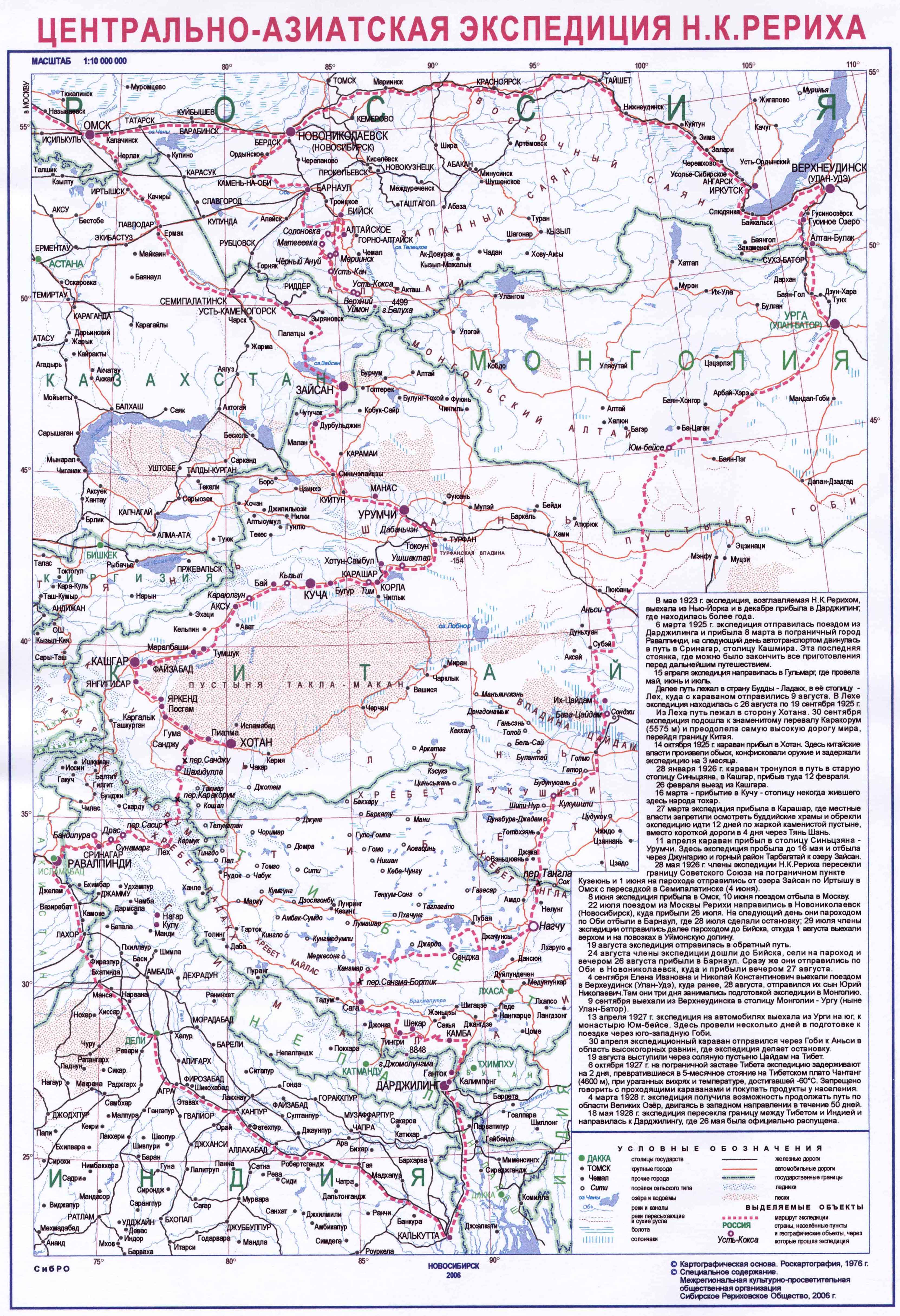 Текст книги Ю.Н. Рериха «По тропам Срединной Азии» (основной источник создания этой карты) дополнен разбивкой по датам исходя из анализа текста, сопоставления с другими дневниками, анализа километража прохождения маршрута и особенностей рельефа местности. Результат этой работы является коллективным мнением рабочей группы и не претендует на абсолютную достоверность. Также не являются абсолютно точными некоторые сложные участки маршрута экспедиции: